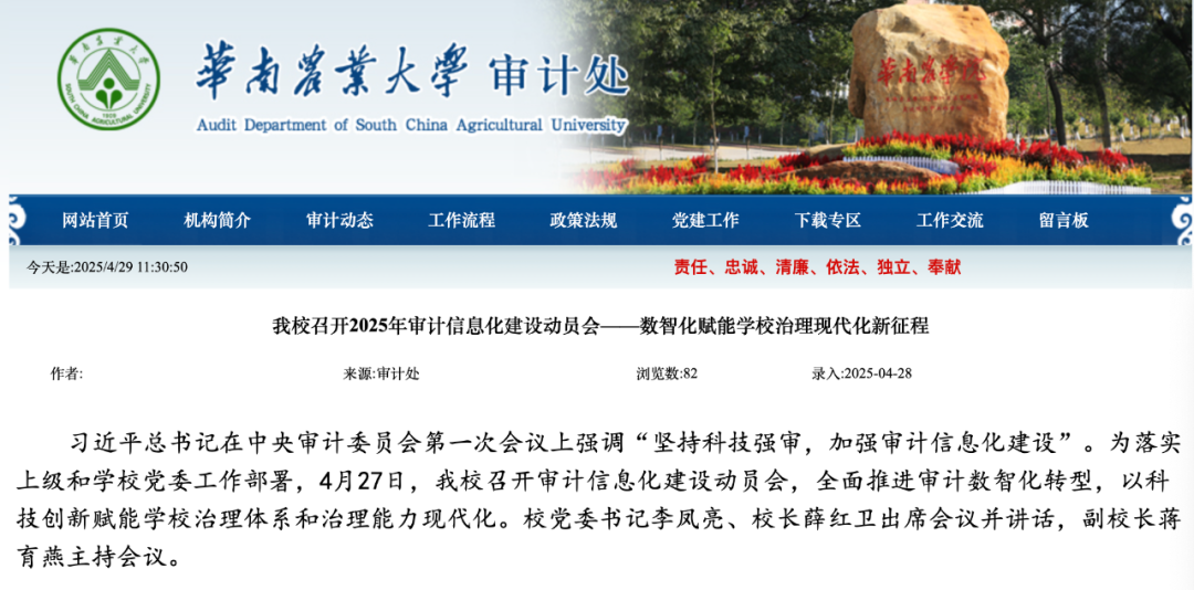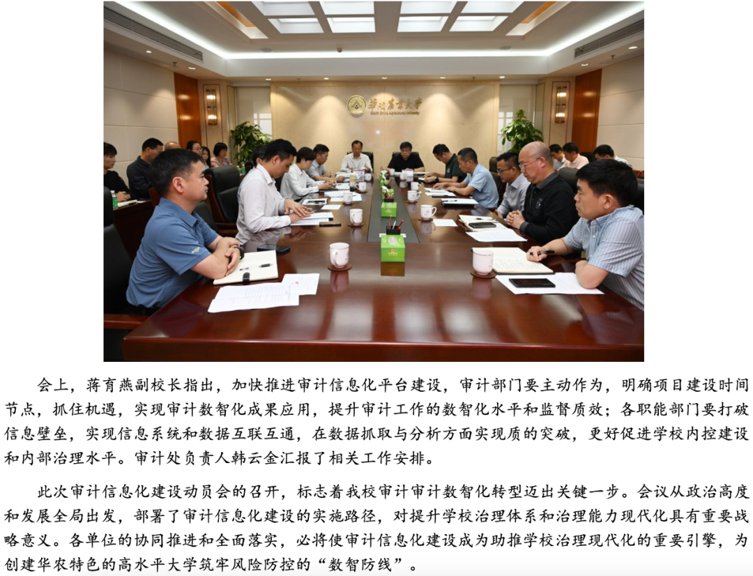 在數(shù)字化轉(zhuǎn)型浪潮中,高校治理能力提升成為“雙一流”建設(shè)的關(guān)鍵突破口,而審計(jì)信息化建設(shè)則是高校“雙一流”建設(shè)的堅(jiān)實(shí)保障。以廣東省教育廳《關(guān)于認(rèn)真做好2025年教育審計(jì)工作的通知》相關(guān)要求為背景,華南農(nóng)業(yè)大學(xué)審計(jì)處積極調(diào)研并開展審計(jì)信息化建設(shè),與我司「北京審友數(shù)治科技有限公司」簽約合作,計(jì)劃構(gòu)建審計(jì)管理、在線作業(yè)、數(shù)據(jù)分析、整改跟蹤、工程審計(jì)、遠(yuǎn)程協(xié)同、決策支持等模塊,助力華南農(nóng)大打造高校審計(jì)信息化標(biāo)桿。