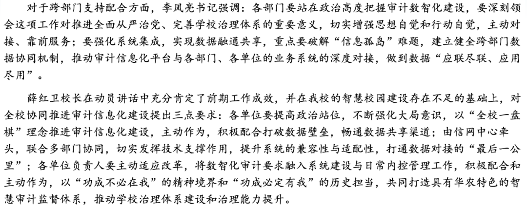 校黨委書記李鳳亮、校長(zhǎng)薛紅衛(wèi)出席會(huì)議并講話,副校長(zhǎng)蔣育燕主持會(huì)議。審友數(shù)治代表有幸受邀參會(huì),向20余位審計(jì)信息化建設(shè)項(xiàng)目相關(guān)單位處長(zhǎng)學(xué)習(xí),共同探討數(shù)智化賦能學(xué)校治理現(xiàn)代化建設(shè)。