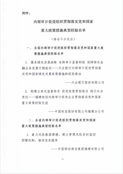 日前,福建省內部審計協會通報內部審計促進組織貫徹落實黨和國家重大政策措施典型經驗名單,以及2021年度內部審計理論研討獲獎情況,由泉州文旅集團提交的《泉州文旅集團促進組織貫徹落實黨和國家重大政策措施的經驗材料》被列入全省典型經驗材料,獲得“福建省2021年內部審計促進組織貫徹落實黨和國家重大政策措施典型經驗”稱號;由泉州文旅集團審計部撰寫的《淺議如何保障國有小股東在混合所有制企業中權益》榮獲全省內部審計理論研討三等獎。