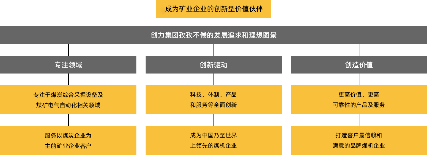 致力成為創新驅動型企業,在專注服務以煤炭企業為主的礦業企業的過程中,依靠強大的研發實力、多元的產品結構、專業的人才隊伍、科學的管理機制、優秀的企業文化形成強大的品牌力,把創力集團打造成中國乃至世界上領先的煤機企業。