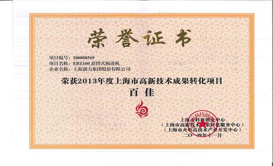 - 2021年度上海市?新技術成果轉化項?百佳:懸臂式掘進機